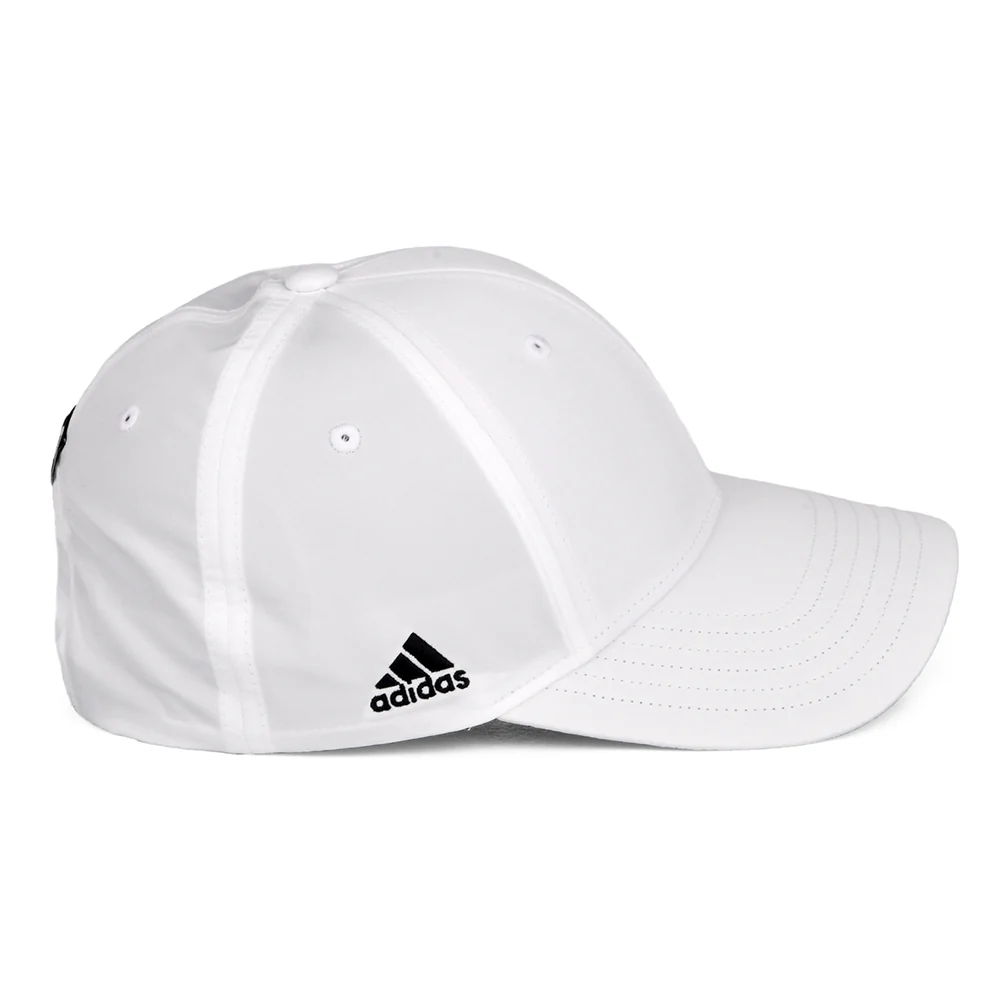 The Adidas Kids Performance Blank Snapback Cap in white is made from 100% recycled materials. The cap features the Adidas logo embroidered on the right side of the cap. There is an adjustable snap at the back to ensure a good fit and an Adidas Golf tag sewn at the back.