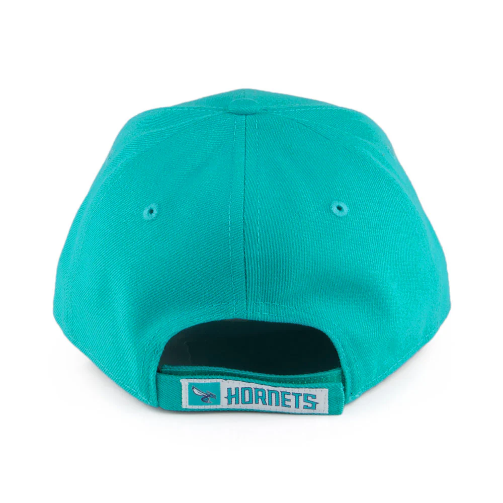 Here is the New Era 9FORTY NBA The League Charlotte Hornets Baseball Cap in teal. This New Era 9FORTY is a structured cap with the team's logo on the front panel and embroidered New Era flag on the left side. The six panel construction features breathable eyelets with a curved visor. An adjustable hook-and-loop strap at the back featuring the team's name and logo ensures a comfortable fit.